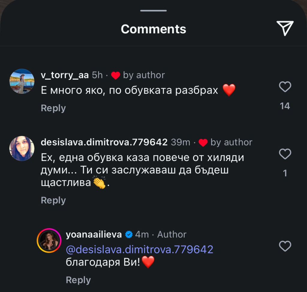 „Ех, една обувка каза повече от хиляди думи… Ти заслужаваш да бъдеш щастлива,“ написа една от почитателките й, на което Илиева отговори: