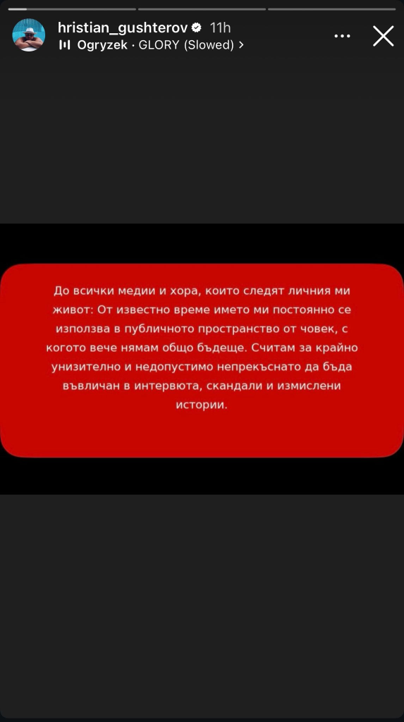 „От известно време името ми постоянно се използва в публичното пространство от човек, с когото вече нямам общо бъдеще. Считам за крайно унизително и недопустимо непрекъснато да бъда въвличан в интервюта, скандали и измислени истории,“ категоричен е Гущеров.