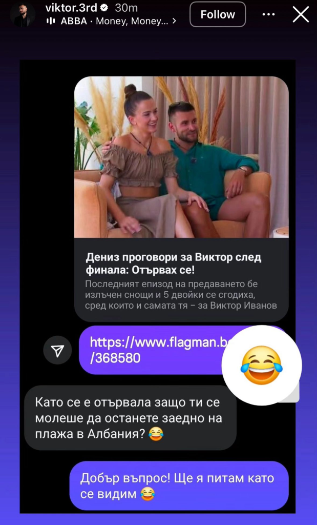 Предприемачът Виктор Иванов и моделката Дениз Хайрула преминаха през любов и сълзи на остров Родос, а приключението им там завърши с силни думи един към друг и годежен пръстен. След предаването обаче бизнесменът се залюбва с годеницата на един от най-близките си предаването, а приятелството между всички остава в миналото. Първо в социалните мрежи Виктор намекна, че нещата между тях не са се получили заради порно на Дениз, а след това нападките между двамата не спряха. Ето я и последната от страна на моделката: