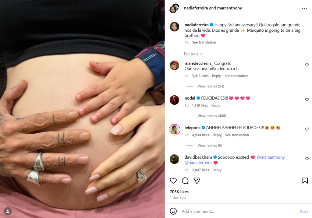 Обичаният изпълнител Марк Антъни очаква осмото си дете със съпругата си – парагвайския модел и „Мис Вселена Парагвай 2021“ Надя Ферейра. 57-годишният певец и 26-годишната му съпруга обявиха, че очакват второто си общо дете заедно, което ще бъде осмо за Антъни. Влюбените зарадваха почитателите си с новината в социалните мрежи, която публикуваха на третата си годишнина заедно. Вижте снимка на коремчето на Ферейра: