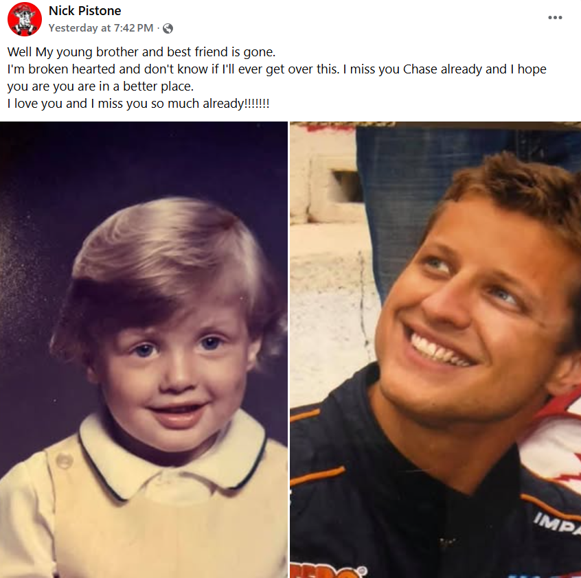 „По-малкият ми брат и най-добър приятел го няма. Сърцето ми е разбито и не знам дали някога ще преживея това. Вече ми липсваш, Чейс, и се надявам да си на по-добро място. Обичам те и вече ми липсваш много!!!!!!!“, написа Ник във Фейсбук.